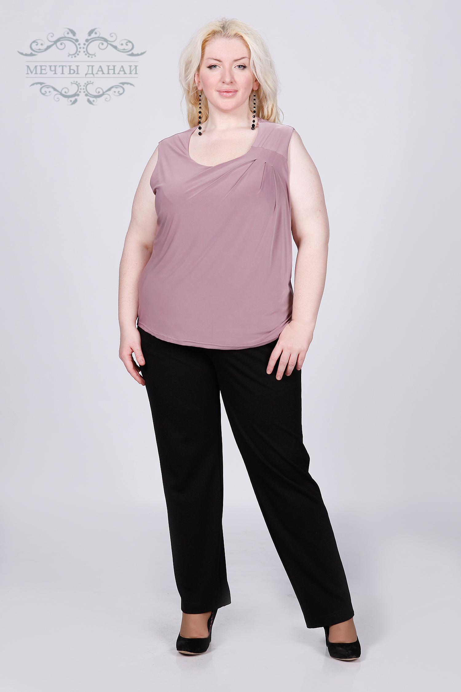 Топ полуоблегающего кроя, спереди двойная ткань, что исключает возможность подчеркнуть живот. Левое плечо украшает несколько заложенных складок. Незаменимый спутник для Ваших пиджаков, кардиганов и т.д.
